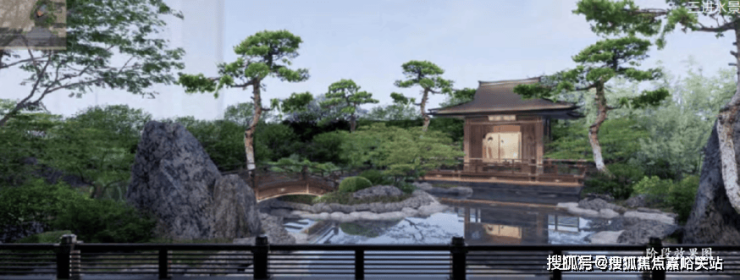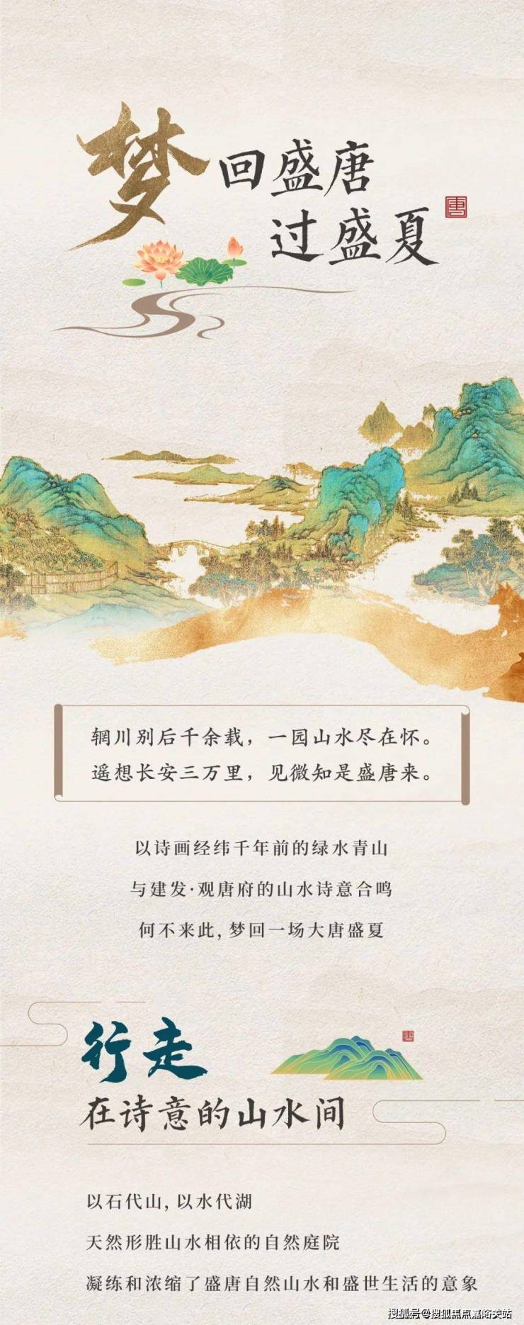 项目采用三段式入户:一进辋川入画(主入口空间),二进:闲庭碎影(戏台庭院),三进:临风听湖(自然庭院)。入户大门屋顶采用唐代“重檐歇山顶”形式配上台基上的唐代建筑标志阑干,入院后有一副唐风画作,其次以亭台楼榭、理水叠山的中国园林意境,重现盛唐大明宫百花争艳,小桥流水,落叶如金的景观。社区景观层层递进,让住户置身其中,体验唐风山水。