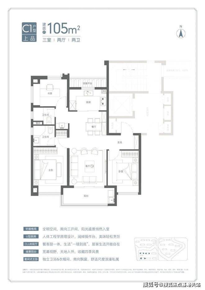 U型厨房、餐厅、客厅、阳台一线联通,南北通透。主卧套房、全卧飘窗、次卫干湿分离也都是标配。