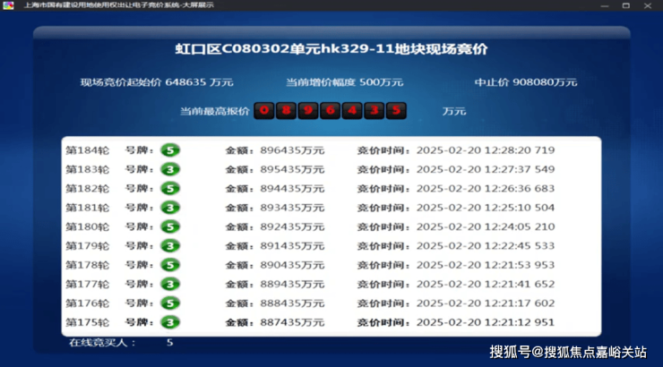 2025年2月,今年第一批次土拍中, 经过 184轮 竞价, 金茂&庆隆联合体 以总价896435万元竞得 虹口C080302单元hk329-11地块,溢价率38.2%,折合 楼板价117474元/㎡,装修标准不小于4000元/㎡。