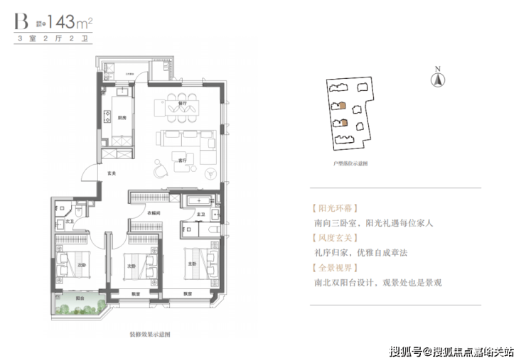 建面约143㎡ 3房产品,边厅户型,拥有超配北阳台空间,可作为家政空间使用,南向全明三卧室,通透舒适。