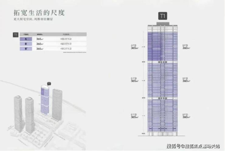 在户型设计上,除了顶层的整层大平层外,其余均是一层两户,每户270°视野三面采光。