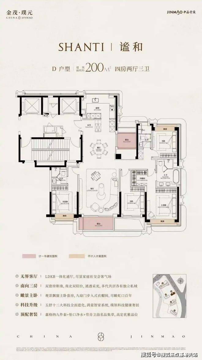 整体采用非对称的结构设计,回应上海东西方文化交融碰撞的城市美学✅金茂璞元售楼处电话:400-8266-670。大胆采用四排楼布局,以保证户户通风采光,类一梯一户无连廊设计✅金茂璞元售楼处电话:400-8266-670,将入户私密性做到极致