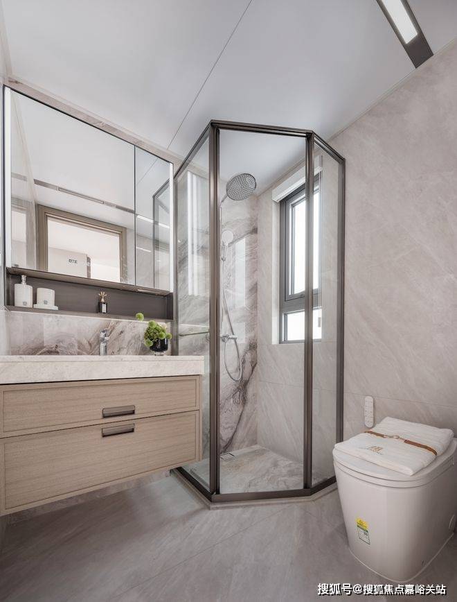 主卧套房式设计,约3.2m的主卧面宽,包括独立的卫浴和飘窗,演绎宽裕尺度。主卫中含大牌恒温花洒、洁具,魔镜内含美妆冰箱:高清镜面,恒温冷藏。