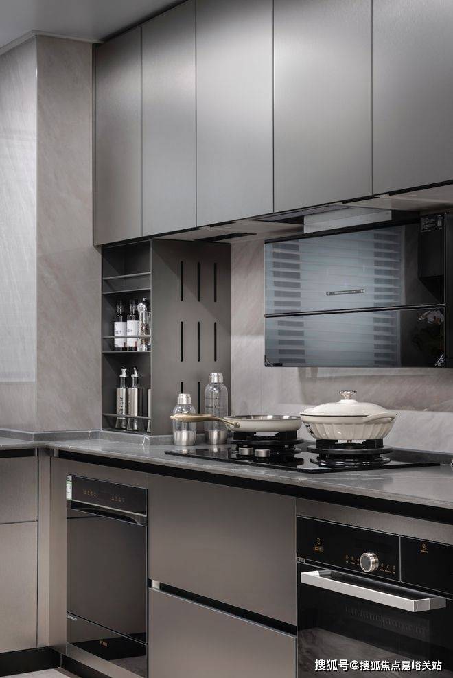 厨房采用U 字型设计,石英石台面,比人造石台面更耐热、耐压。同时标配厨房七件套包括(油烟机/灶台/洗碗机/蒸烤一体机/冰箱等),还有末端净水器和凉霸。