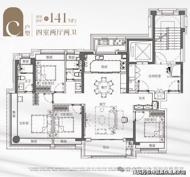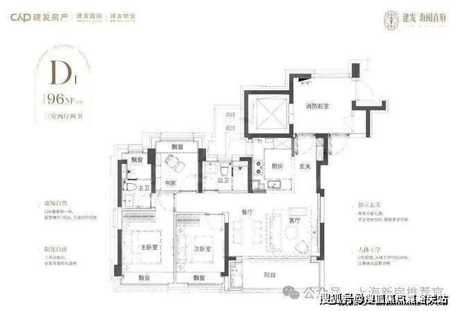 户型特点:96㎡三房两卫为经典飞机户型,三开间朝南,主卧套房设计,全屋飘窗;103㎡三房两卫动静分离,南向超阔面宽横厅,LDKB 一体化设计;124㎡四房两卫全屋四个飘窗,LDK 一体化设计;143㎡四房两卫有 270° 观景视野,独立家政间。