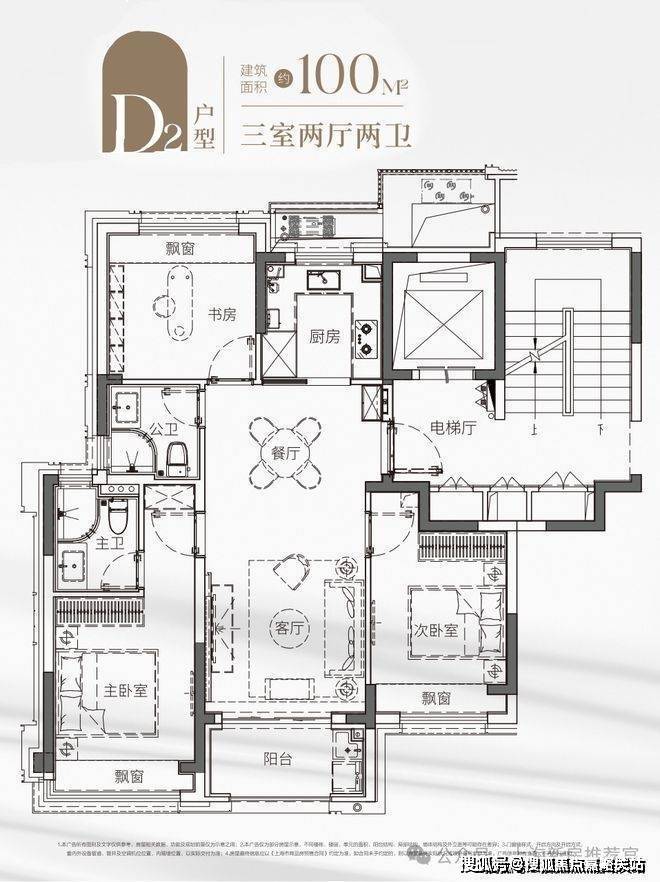 另一套 建面约100㎡飞机户型,同样做了三房两卫,户型方正,几乎无过道设计,每一寸空间都没有浪费,舒适不局促。