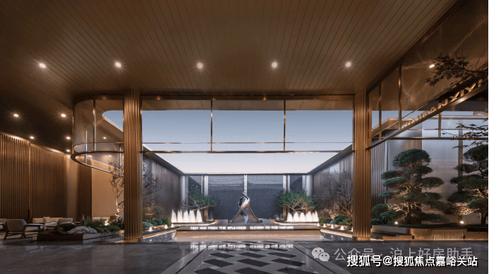 入口处酒店港湾式落客空间,艺术感造型树,蓝翡翠奢石达到第一眼的惊艳;内部精致典藏的水院空间,以雕塑、喷泉水幕、造型树经典组合,打造全区景观点,更大地扩充与景观的接触面,度假的松弛感油然而生。