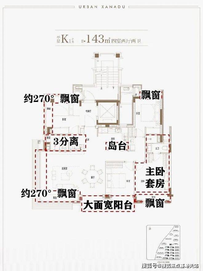 户型打造了4个约270°全景飘窗,其中3个卧室和客餐厅都配备了全景飘窗,整体敞亮不压抑。