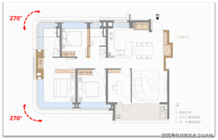 第三处山墙s墙的技术含量更高,直接让户型拥有 两个大转角飘窗 (主卧+主卫均双270°弧形转角飘窗)。凹处填放一个 衣柜, 视觉效果舒适,业主第一眼无知无觉,殊不知背后大有玄妙。