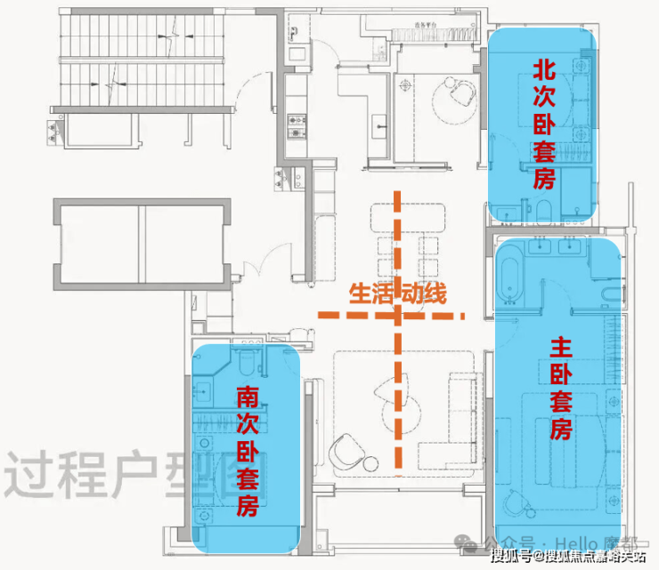 同时,北向卧室外配置卫生间,按照现代中国人的家庭成员配置,三代同堂5口人计算,北卧被当作套房使用的概率更大。