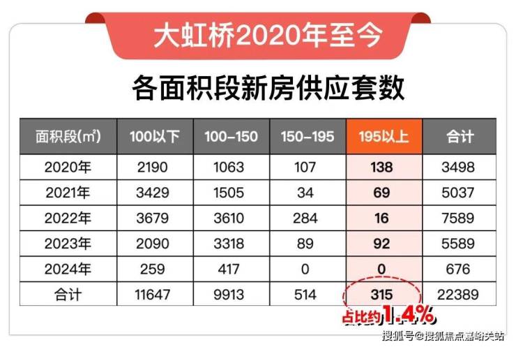 2020年至今,大虹桥共供应22389套新房,其中建面约195㎡以上户型仅315套,今年为止更是0供应(截至2024.4.9),占比只有约1.4%