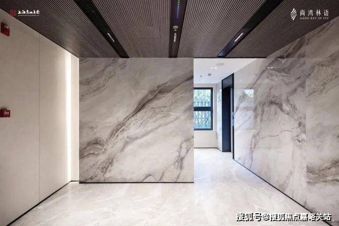 进入南入户大堂,能感受到具有仪式感的现代轻奢设计,灰色大面铝板搭配金色格栅,每一次入户都能体验到无比尊崇的感觉。内部墙面做了大面积岩板,以及具有设计感的吊顶,更贴心地配备了空调,营造舒适的环境。