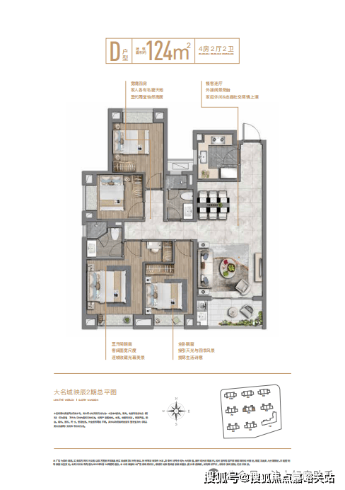 其中,124㎡的四房户型配备了270°L型飘窗,提供极佳的观景体验。约3米的层高和南向双卧室+北向多功能房的布局,既能满足二孩家庭的分龄需求,又为居家办公等提供了可能性。