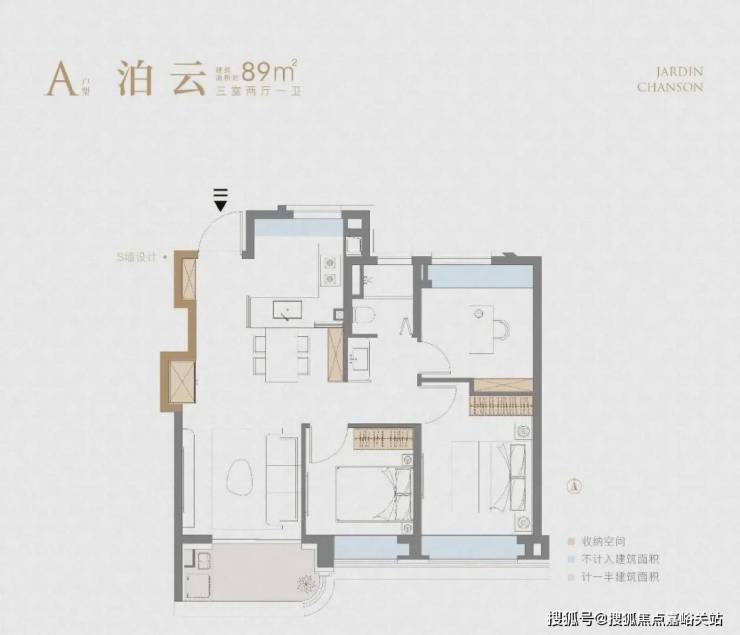 重点我想说说该户型的收纳,大量S墙的设计简直见缝插针,极大的扩容了家的储物角落,消减了业主生活的繁琐。