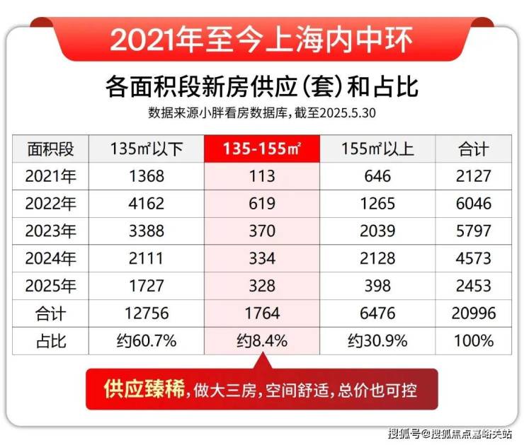 据小胖看房数据库显示,自2021年至今,内中环供应中,135㎡以下户型占比高达约60%,且多为90-110㎡小户型, 这类“70/90 政策”下的产物,未来几年将大量涌入二手房市场,竞争白热化。