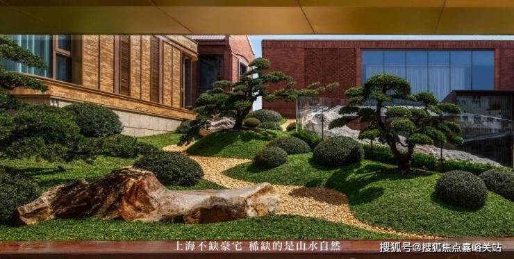 山水庭院汲取《足立美术馆》的造境手法,以老石皮、百年古木原样搬运,重现山间岁月的自然痕迹,与庭院中的光影交织,仿佛将山间的自然采光与静谧之感搬入城市。阳光透过树梢洒落,石皮上的纹理在光影中若隐若现,宛如一幅流动的自然山水画卷。