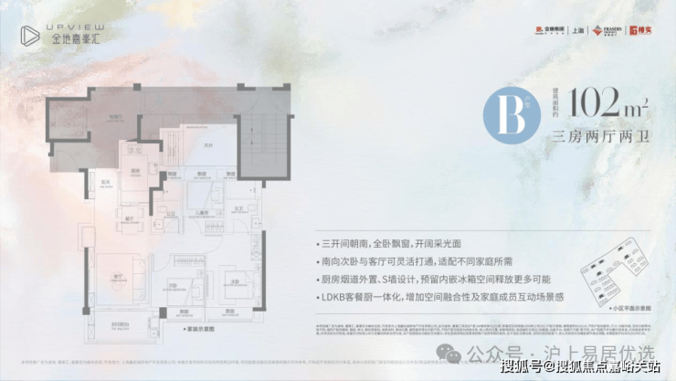A户型是建面约102㎡3房2厅2卫,该户型 三开间朝南 , 采光效果上佳。 大方厅设计 ,空间开阔自由度更高。南向次卧和客厅可灵活打通,适配不同家庭所需; 大进深阳台+全景落地窗 ,让室内的通透性和视野可圈可点。