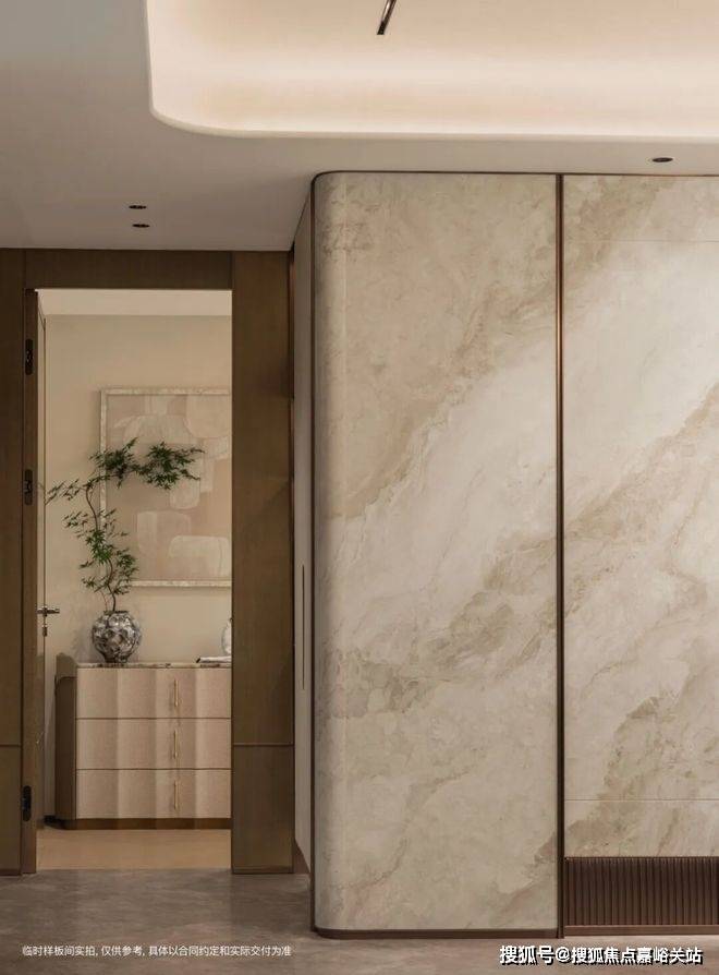 √ 细节审美:客餐厅900*1800mm大砖无缝通铺至厨房,内敛高级;岩板背景墙做热弯处理,细节处彰显质感;全屋无主灯设计,搭配3500k色温射灯与艺术漆顶面,层次感十足……