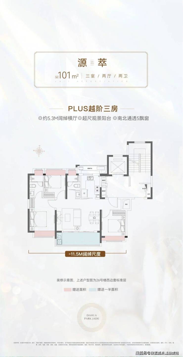经典飞机户型+三开间朝南+餐客厨一体化+约5.3m的阔绰横厅,整体南向面宽达到约11.5m!整个户型的通透度和采光度很棒。