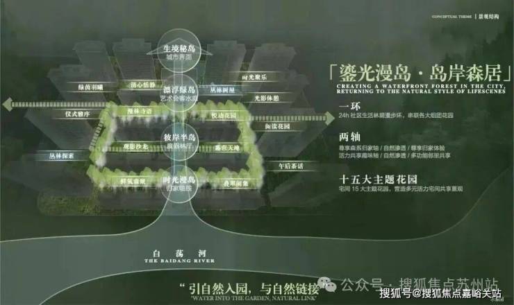 以“山水聚场”理念,规划“一环两轴十五园”景观布局,将水岸、岛屿、森林、花园、树屋作为园林节点,形成“行在景中、坐在岛中、游在林中、意在境中”的美学表达,营造出沉浸式山水活力场域。