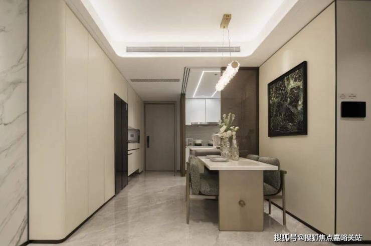 值得一提的是,入户玄关设置一整面的玄关柜空间,左侧分户墙处增设“凹型空间", 预留内嵌双开门冰箱空间。