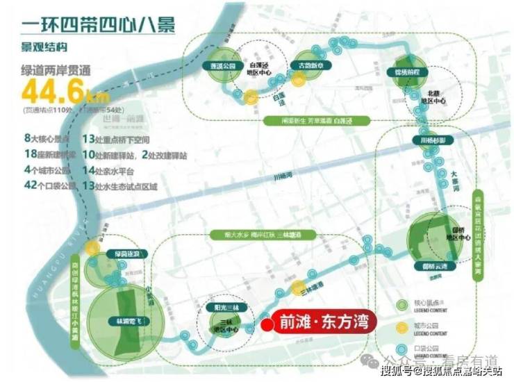 周边前滩友城公园、前滩体育公园、东明公园等已建成公园,三林塘港、“林浦莺飞”、“绿茵逐浪”等核心景点将连缀成片,形成气势磅礴的滨水公园带。
