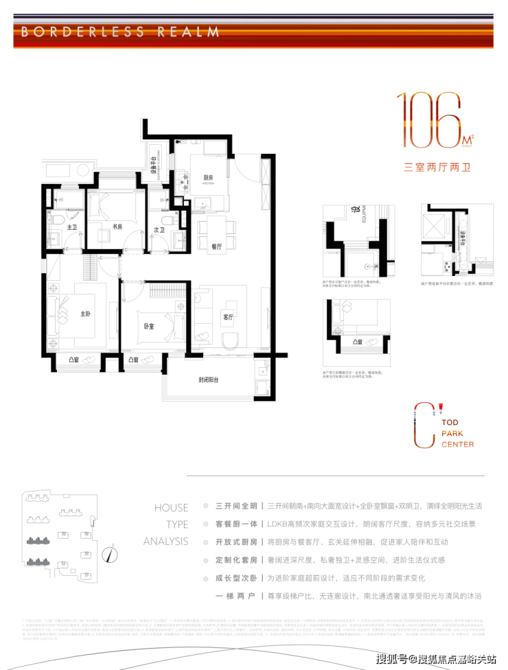 只有可生长的空间,才能适配成长家庭。 建面约106㎡三房两厅两卫,一梯两户无连廊,不仅得房率高,而且私密性更强。