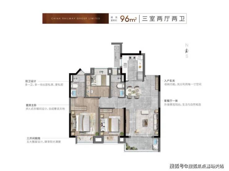 约89㎡的建面即能实现3房功能性还有2卫,主卧实现套房配置,放眼全市性价比都分外突出!格局上做到了三开间朝南,采光效果佳,客餐厨一体化减少动线,对室内面积极致利用!