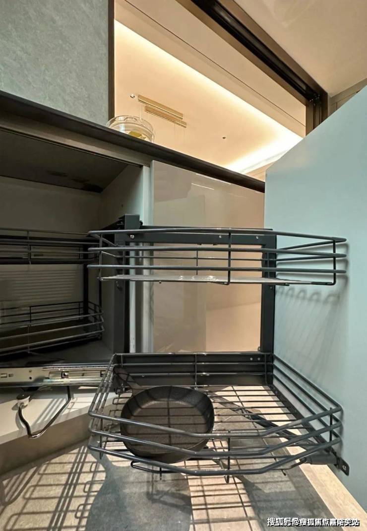 下方的橱柜则做了 转角拉篮,充分利用转角空间,使物品井然有序的同时,轻松方便取放。