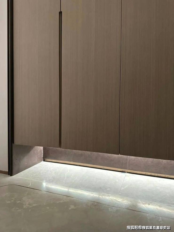 鞋柜下方做了 悬浮处理,同样也是 内嵌灯带,这里灯光的角度还会再调整,因为灯光映射在大理石地面上,要显得尽量柔和不刺眼;同时,鞋柜下方可放拖鞋,还能放扫地机器人,便于日常清扫打理。