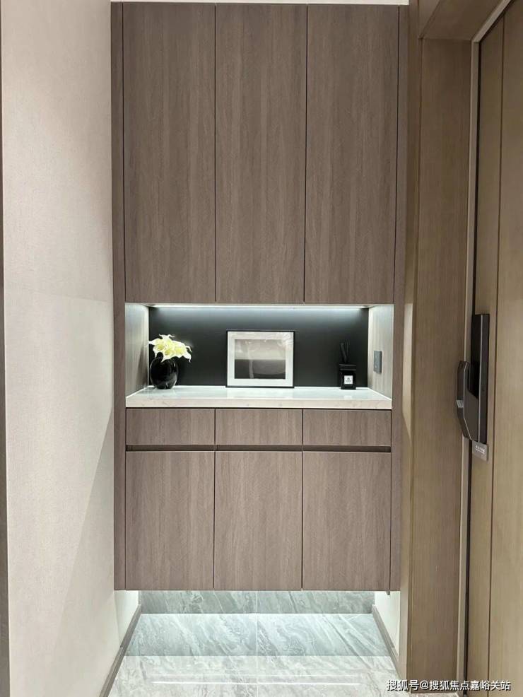 入户玄关更是设计了大量的收纳空间。底部架空,可以用来摆放鞋子,并设置有嵌入式灯带,整体的氛围感拉满。