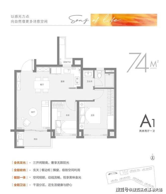 建面约74㎡2房竟做到三开间朝南,其中两卧均朝南,同时面宽甚至大于进深,这比同类产品卧室一南一北狭长布局要舒适得多。