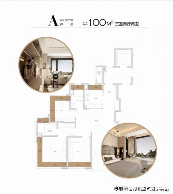 100㎡户型,双270°飘窗设计(南向主卧+北向书房),南次卧、厨房、双卫飘窗,厨房烟道外移,飘窗配置抽屉,极致空间利用率。