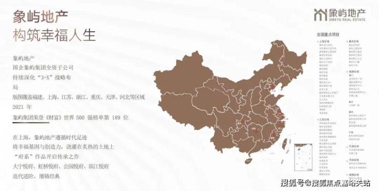 象屿地产,构筑幸福人生国企象屿集团全资子公司,持续深化“3+X”战略布局,版图覆盖福建、上海、江苏、浙江、重庆、天津、河北等区域。 2022年,象屿集团荣登《财富》世界五百强榜单第160位。