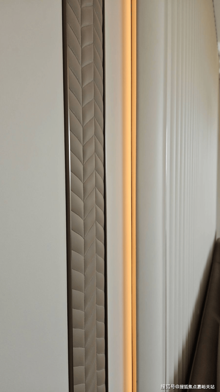 我们来看墙体的细节处,墙面同样做了层叠设计,从侧面看,立体感明显。石材墙面开槽,镶嵌有金属条点缀,注意,这样的点缀条,也做了弧形处理。