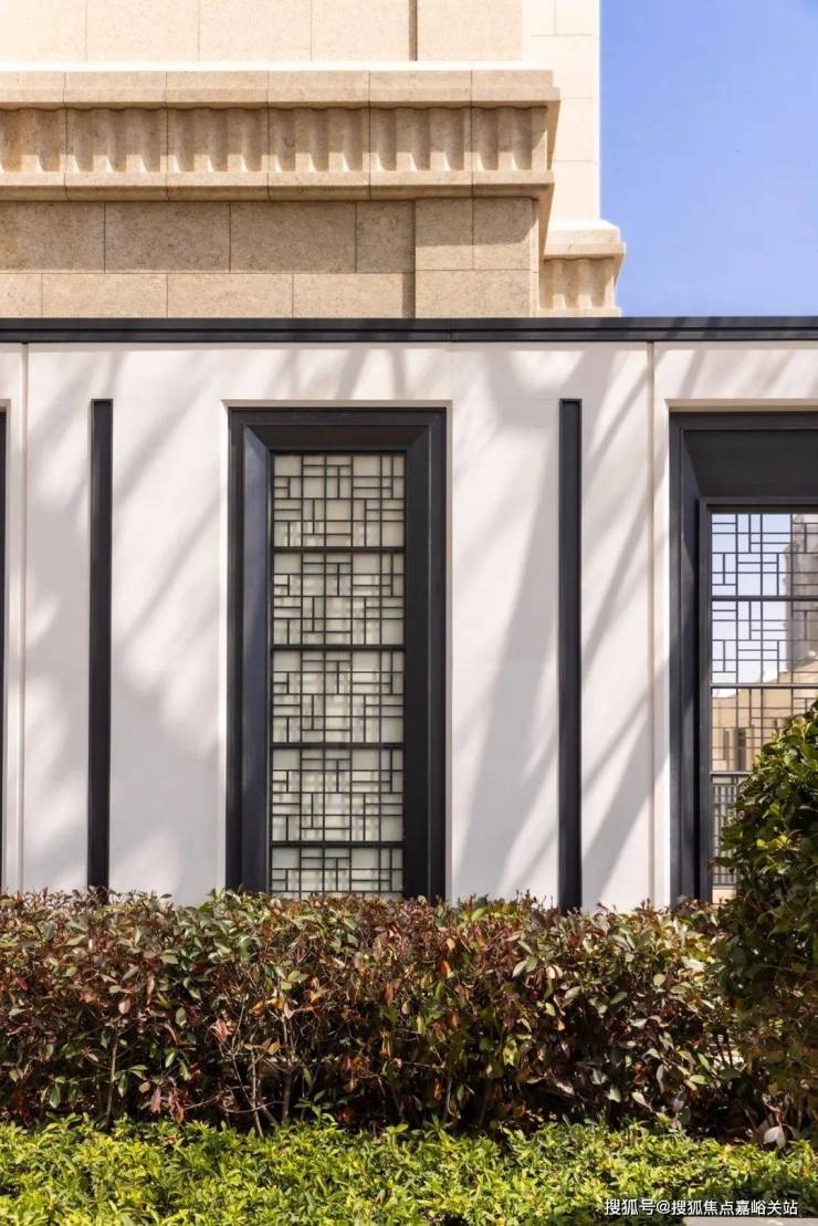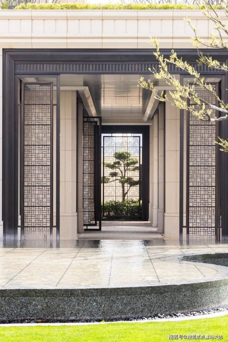 再来看公区,庭院的格栅,同样做了造型化处理,镂空形状不一,随着日光位置的变化,阳光洒落,造型十分灵动。