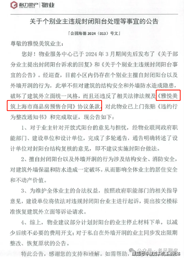 该项目的物业也出了相关的公告,对于这种私自封阳台的行为进行了回复、规劝和取证。(如下图)