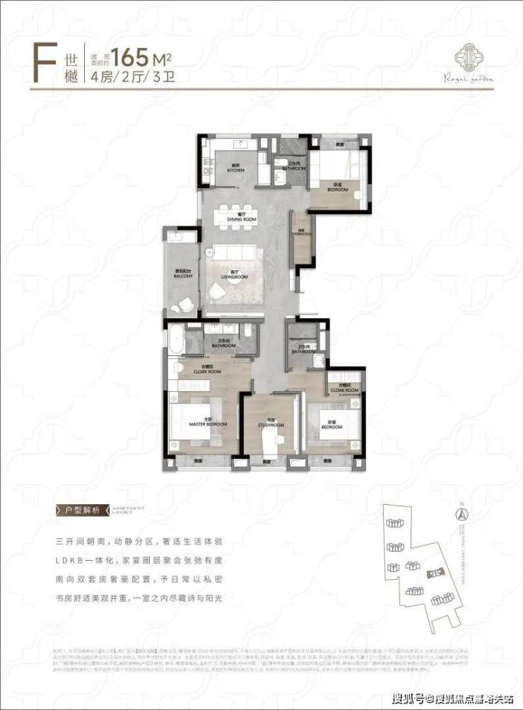 104㎡3户型特点:该户型多为楼栋的东边套,是一个观景户型。客厅连接270°阳台,视野出众。双卧朝南,阳光满溢。从次卫布局看,如果家庭人口较少,该户型还能做成双套卧。