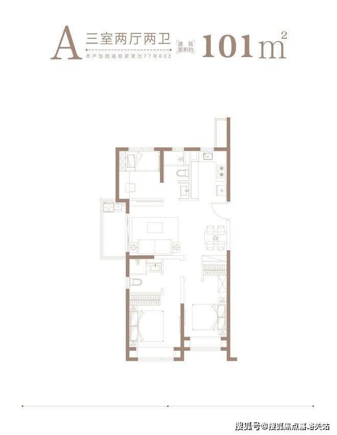 1、约101㎡均为3房2厅2卫,A、B户型分别是边套、中间套,满足不同人群的居住需求。