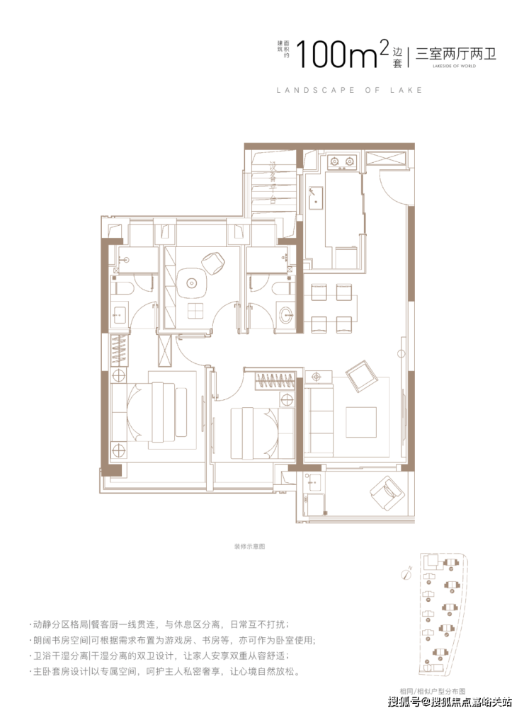 建面约100㎡3房2厅2卫,做到了 三开间朝南+主卧套房设计+动静分离+全卧室带飘窗,功能性和尺度感完美结合的3房户型。