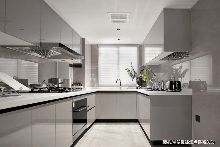 厨房空间,采用铝合金玻璃PVC饰面的免漆门套及铝合金移门,三件套使用 老板的油烟机、燃气灶、洗碗机交付,更有摩恩的水槽和龙头、定制的组合橱柜。