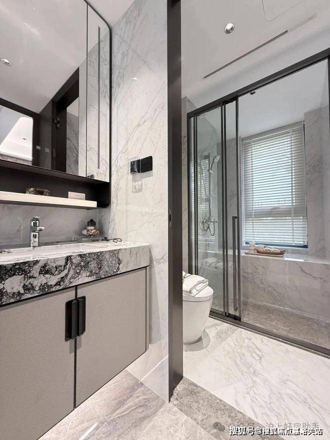 海上清和玺售楼处电话:400-8894-986奢石台面,皮革饰面柜抽屉,侧端设置金属收纳开放格;定制镜柜,中间的透光玉石直接提升了高级感,镜柜内部配备了美妆冰箱+美妆灯条+轨道收纳!