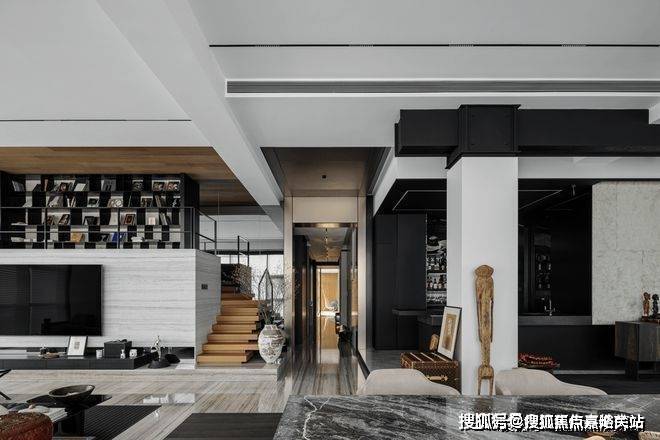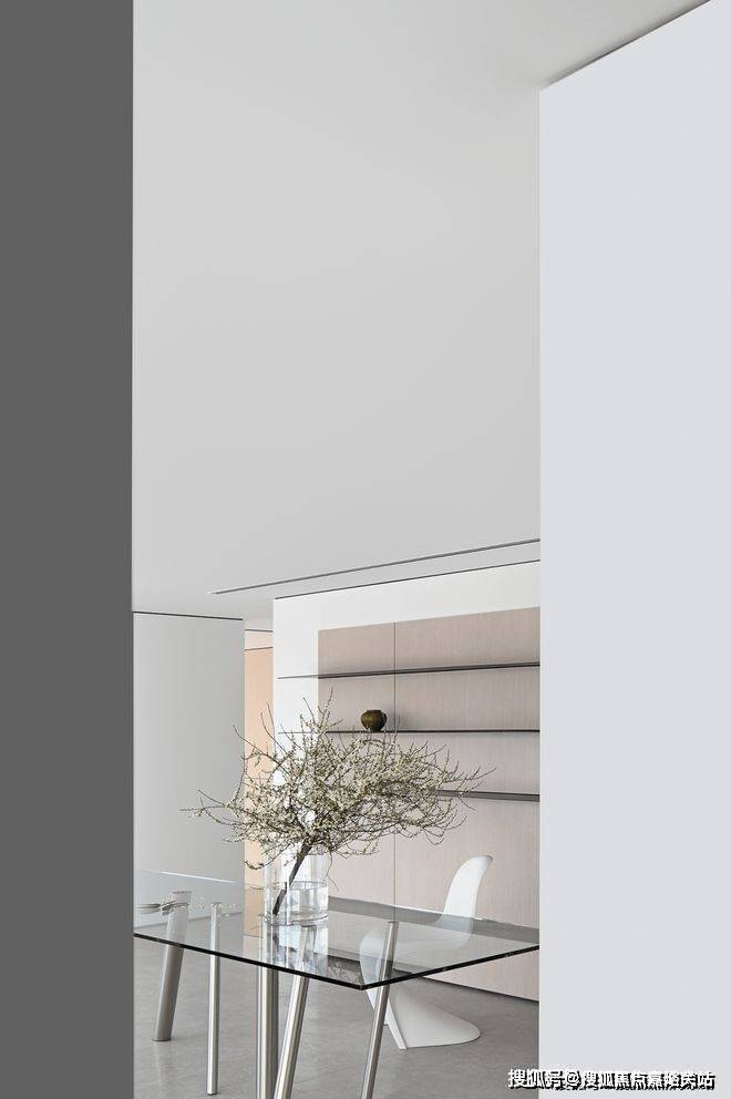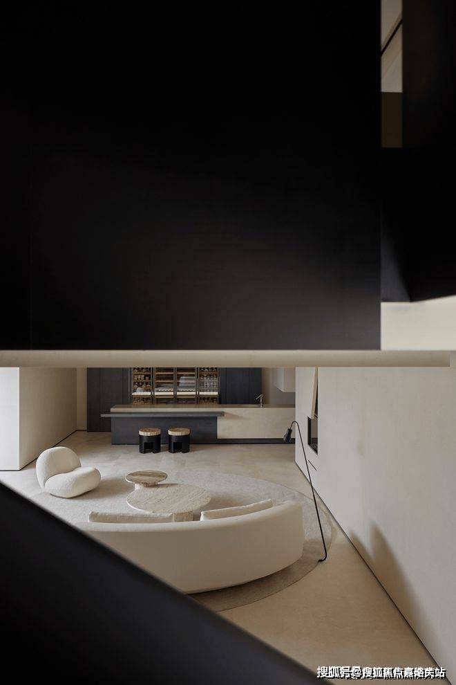 空间是光影的容器,自然光穿透白色的纱帘给会客厅加了一层摩登的滤镜。两侧纱帘光影通透,暗香浮动,几丝波影乍如烟。一处吧台,临烟火,酌清欢。烟火清欢,一半一半。