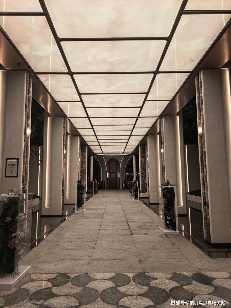 这个挑高约3.6米的地下空间,处处彰显着奢雅质感:环岛式落客区便捷舒适,整石雕塑静静伫立,伊万翡翠奢石墙面温润细腻,地面则由五万片小弹石手工密拼而成,每一处细节都透着用心。而地上归家动线同样尊崇,约9米挑高的鎏金门庭静立水岸,整块天然石材铺就的背景墙搭配定制艺术雕塑,勾勒出高端人居的归家排场,无论是地上还是地下归家,都能感受到同等的尊重与舒适。