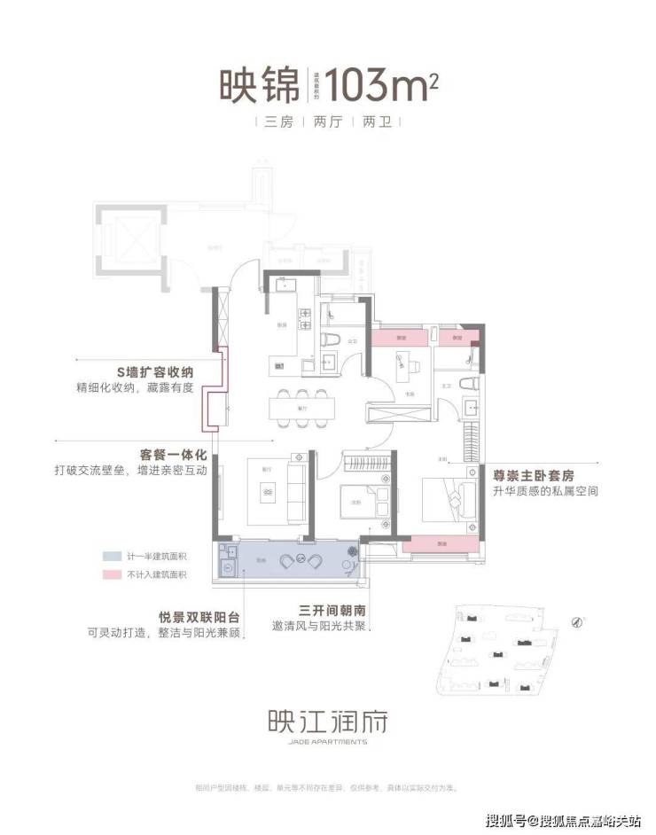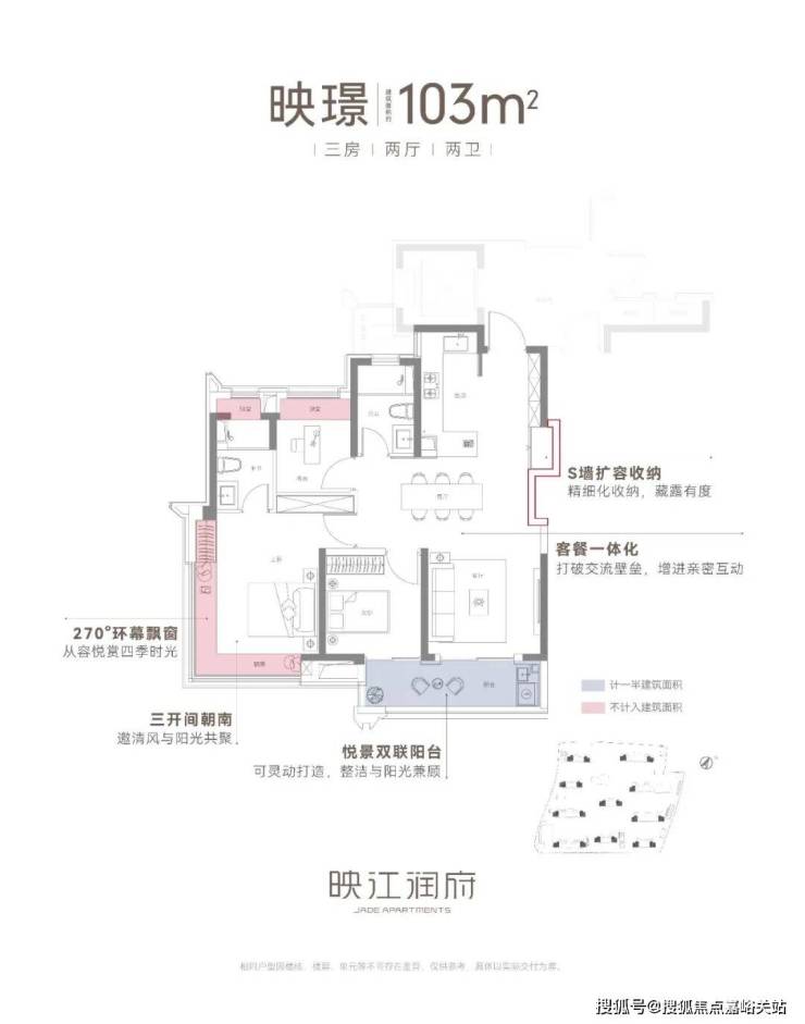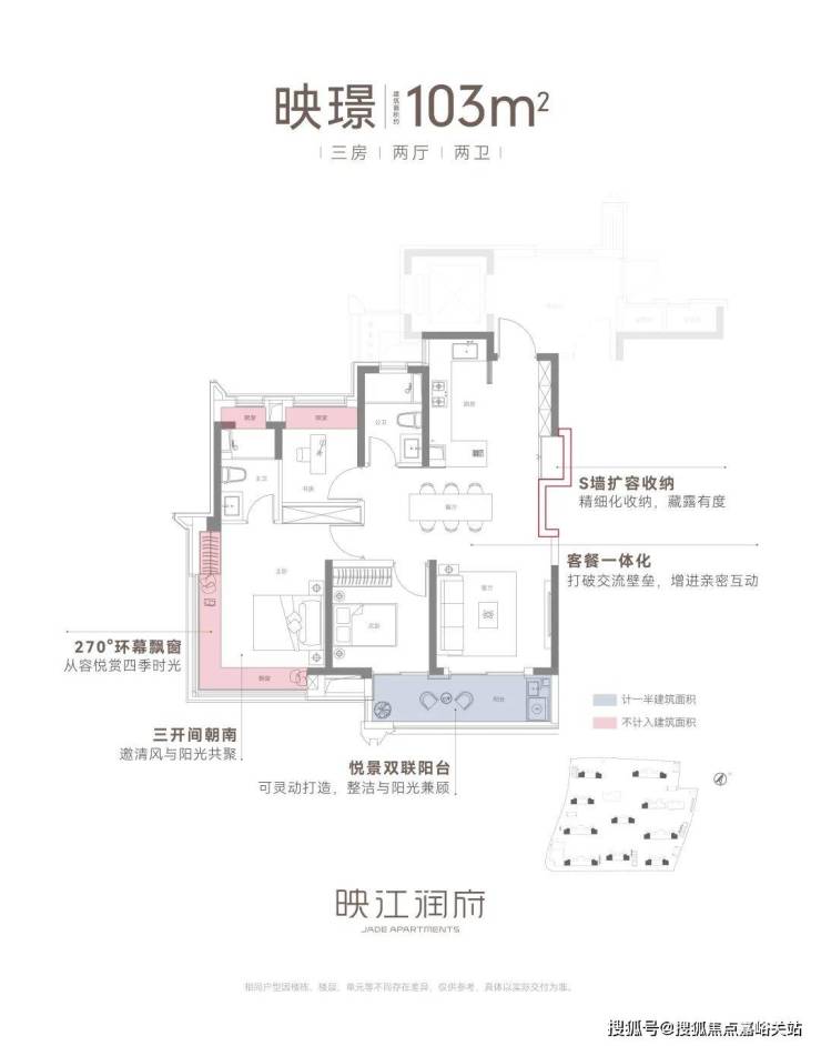 建筑面积约103㎡三房两厅两卫,不失为改善家庭的首选。其中边套户型,映江润府的主卧套房做了 270°环幕飘窗,实现无与伦比的采光通风和视野享受,类比于千万级豪宅的体验!
