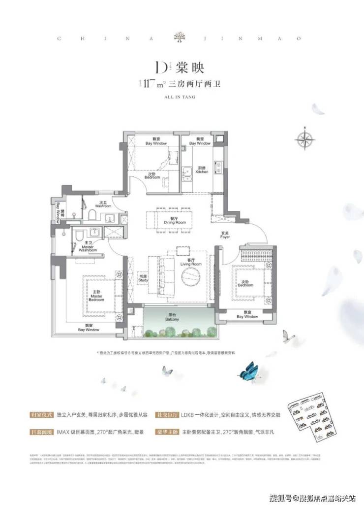 建面约117㎡3房2厅2卫 ,做到了 3+1开间朝南+5个飘窗+主卧套房设计+270°转角飘窗, 所有的尺度都有进一步提升。