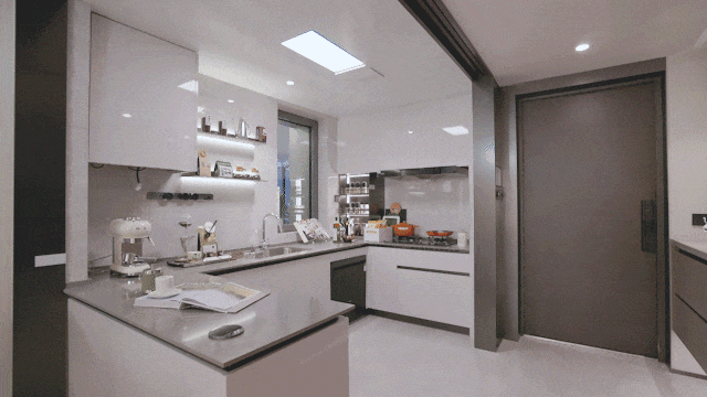 最硬核的莫过于厨房的细节了。首先就是德系精工品牌西门子的抽油烟机和灶具,洗碗机为方太高端系列,另外建面约150㎡的户型还而外设置了方太高端系列的蒸烤一体机。