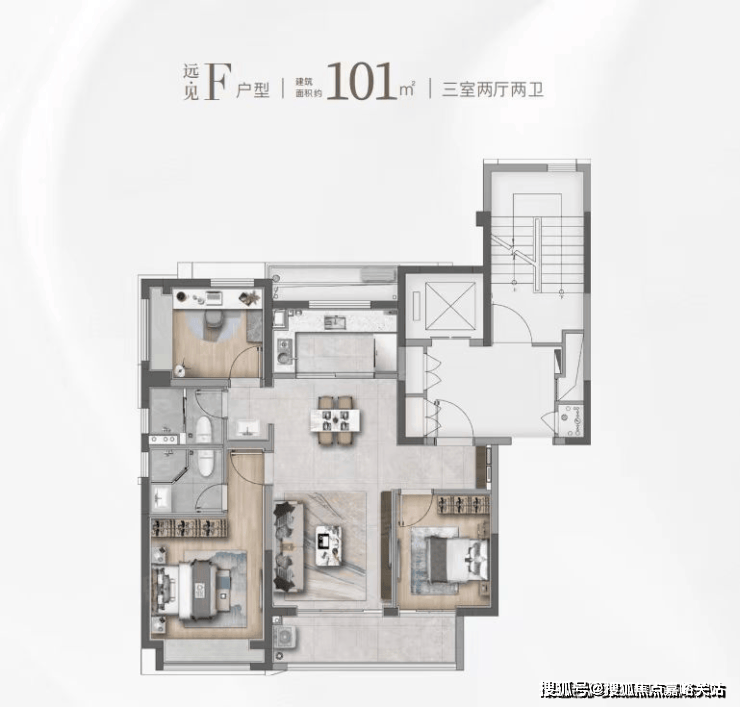 建面约101㎡的F和G户型都是市面上备受认可的飞机经典款户型。