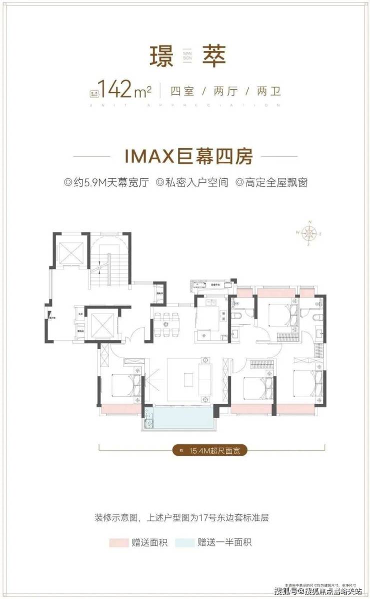 倘若拥有更高的预算,那么这套建面约142㎡4房2厅2卫非常适合改善家庭的需求。其南向面宽达到了15.4米,比肩豪宅平层产品的气场和尺度感。
