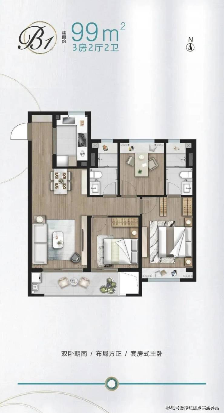 建面约89㎡做3房,功能性上就占尽先机,没想到项目还有1.5卫配置, 主卧升级套房,真正实现一步到位!